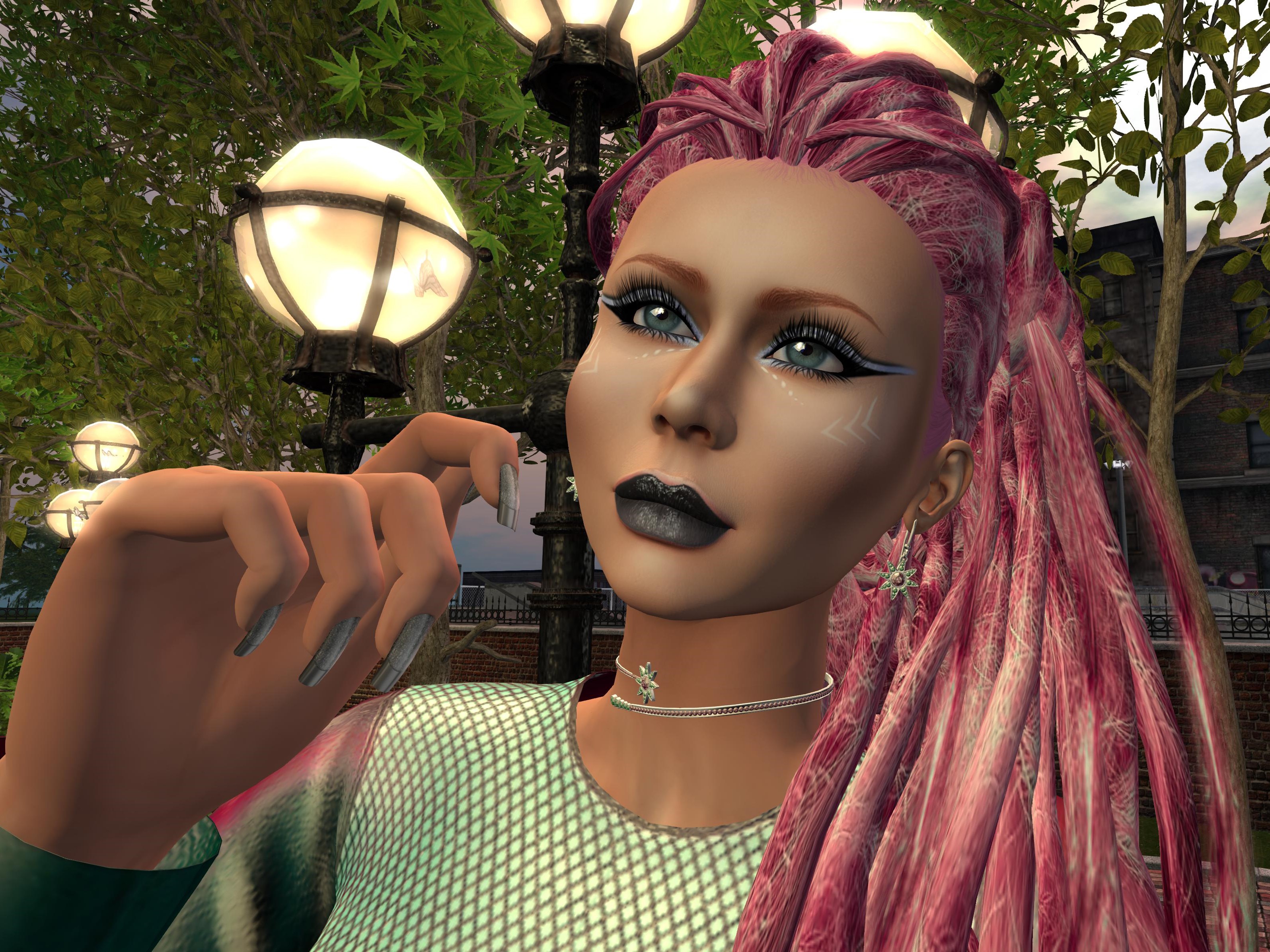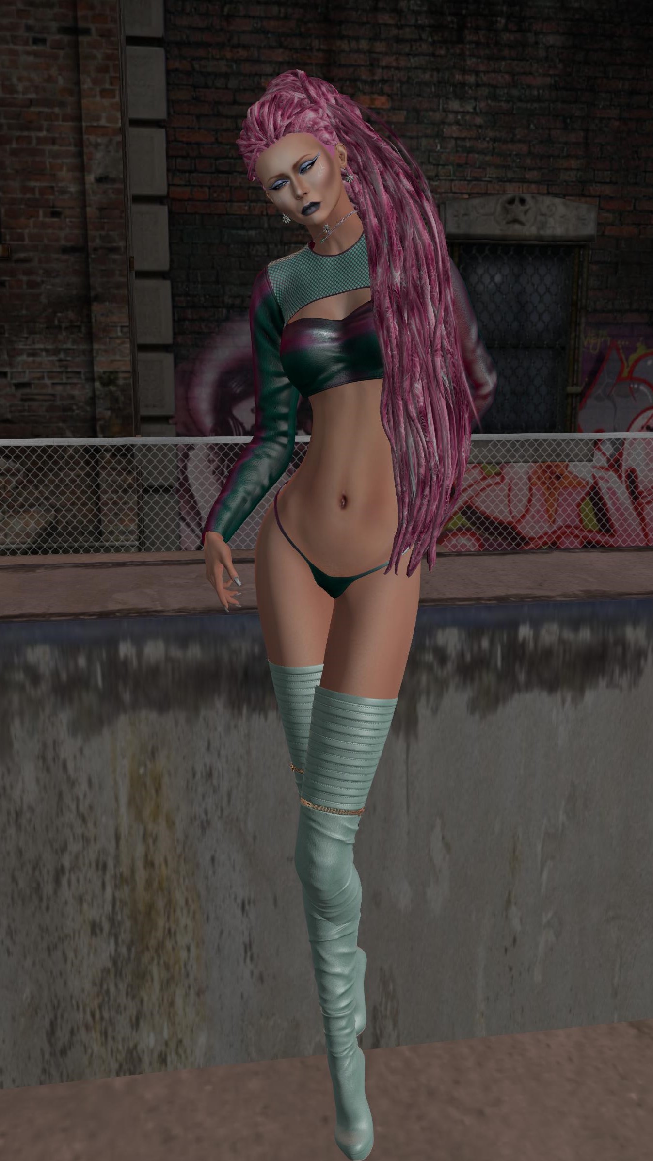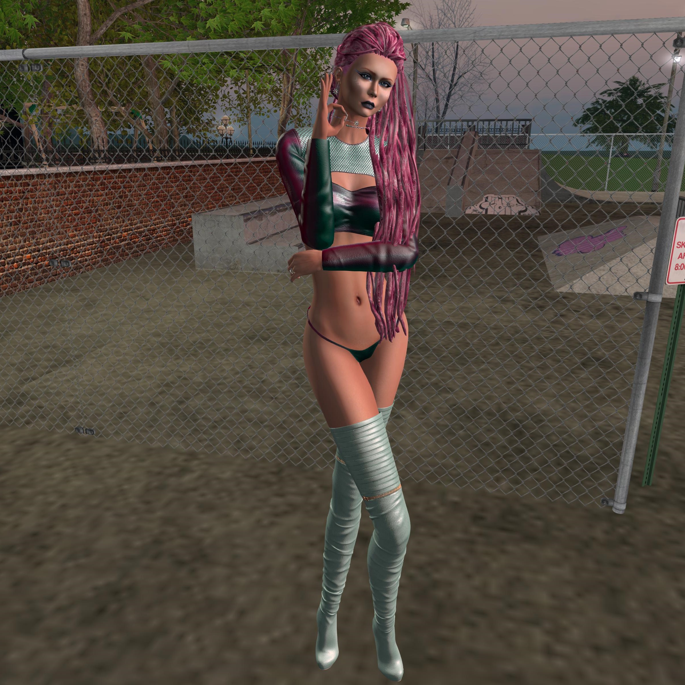 It’s “PUNK” night!!! Wearing the OUT OF THIS WORLD outfit, that will be coming soon at the Evolve Mainstore. This is very versatile. I decided to dye my hair my pink and go punk for a change. You can wear it mostly at any casual rock clubs. I found this cool Punk Rock Club on a small sim with another club a few blocks down.