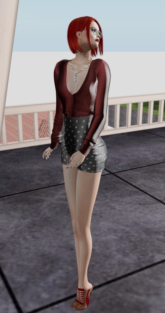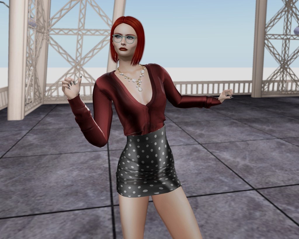 Decided to take in the view from the top of the Eiffel Tower on the Moulin Rouge Sim. Wearing the Evolve’s Fifty -5 Linden Thursday outfit. This is a shirt set that comes with a color hud for both skirt and shirt. Have fun mixing and matching.