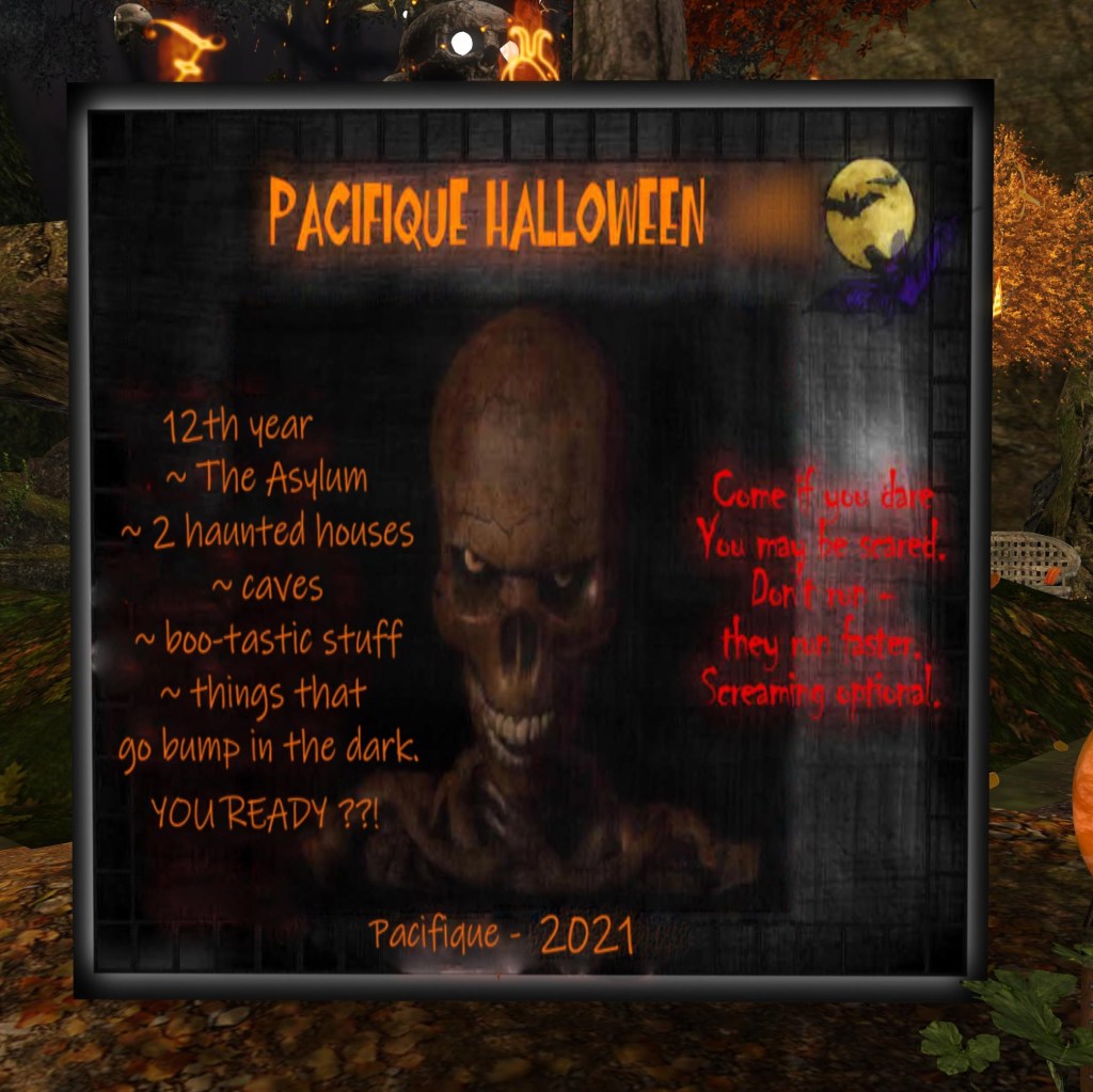 Pacifique has been around since 2008. It has been my second home is Second Life for a very long time. Can take the teleporter to the different areas. Its a place to explore, cuddle, dance and most of all make new friends.. We welcome all to come and have fun. It started out on small region and being apart of it all these years, watching it grow to what it is now.. It is listed in Second Life Destinations this year, as it did so many times over the past years. Each year Pacifique Halloween has gotten more scarier… Be ready to see dancing and drunken skeletons along with zombies. Creatures popping out at you as you walk along the trails I dont want to say to much, it has to be experienced. I do advise not to stand in one place to long.